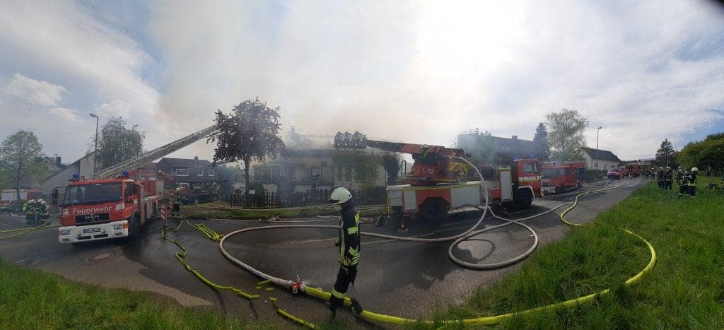 Oestrich-Winkel – Am Mittwochnachmittag kam es im Stadtteil Hallgarten von Oestrich-Winkel zu einem mehrstündigen Großeinsatz aufgrund eines Brandes in einem Wohngebäude in der Rebhangstraße. Drei Bewohner sowie ein Hund waren zum Zeitpunkt des Brandes im Gebäude als sie im Dachgeschoss das Feuer bemerkten. Nach eigenen Löschversuchen die wirkungslos blieben wurde per Notruf 112 die Feuerwehr um Hilfe gerufen. Kurz vor 15.30 Uhr wurden die Feuerwehren aus Oestrich-Winkel sowie der Gerätewagen Atemschutz aus Eltville und der Rettungsdienst zu einem Wohngebäudebrand mit mehreren Menschenleben in Gefahr alarmiert. Nach Eintreffen der ersten Einsatzkräfte und einer ersten Lageerkundung bei der das Dachgeschoß bereits im Vollbrand stand wurden zwei weitere Drehleitern nachgefordert. Anfangs konnten die Feuerwehren noch mit zwei Angriffstrupps unter schweren Atemschutz einen Innenangriff durchführen, der aber schnell aufgrund einstürzender Dachteile abgebrochen werden musste. Im hinteren Bereich des Gebäudes war eine Photovoltaikanlage angebracht, die die Löscharbeiten ebenfalls teils erschwerte. Zeitweise waren 4 C- Rohre und 3 Wenderohre über die Drehleitern aus Oestrich, Geisenheim und Eltville gleichzeitig im Einsatz. Die gesamten Löscharbeiten konnten nur von Trupps mit Atemschutzgeräten vorgenommen werden, da die Rauchentwicklung zeitwiese immer wieder sehr stark war. Gut zwei Stunden dauerte es bis das Feuer so gut wie gelöscht war bevor dann die Nachlöscharbeiten anstanden. Ein Bewohner musste vorsorglich wegen einer Rauchgasvergiftung zur Untersuchung ins Krankenhaus, die anderen beiden Bewohnerinnen und ein Nachbar wurden vor Ort vom Rettungsdienst betreut. Die betroffene Familie und der Hund kommen vorerst bei Verwandten unter. Während des Einsatzes hat die Einsatzleitung den überörtlichen Löschzug der Stadt Rüdesheim angefordert, der vor Ort nach Rücksprache aber dann nicht mehr eingesetzt werden musste, aber bis nach 19 Uhr die Einsatzbereitschaft für eventuell weitere Einsätze im Stadtgebiet Oestrich-Winkel übernahm. Insgesamt waren zeitweise über 120 Einsatzkräfte von Feuerwehr, Rettungsdiensten, Brandschutzaufsichtsdienst, Polizei, Ordnungspolizei und Bürgermeister Stadt Oestrich-Winkel, Gasversorger und Wassermeister vor Ort. Der Einsatz vor Ort hat sich bis in die späten Abendstunden hingezogen und überall stehen bei den beteiligten Feuerwehren noch Reinigungs- und Aufräumarbeiten in den kommenden Tagen an. Zur Brandursache wird seitens der Polizei ermittelt und nach deren Angaben schätzt sie den Schaden auf 400.000 Euro.