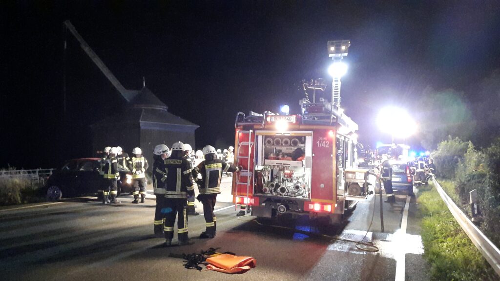 Oestrich-Winkel – Am späten Sonntagabend kam es zu einem schweren Verkehrsunfall mit zwei beteiligten Fahrzeugen auf der B42 Höhe Oestricher Kran. Hierbei wurden drei Personen zum Teil schwer verletzt. Die Feuerwehren Hallgarten, Oestrich und Mittelheim wurden zu einem Verkehrsunfall mit eingeklemmter Person alarmiert. Aus einem der beiden betroffenen Fahrzeuge musste eine Frau mittels hydraulischem Rettungsgerät befreit werden. Die zwei anderen Personen waren in ihrem Fahrzeug nicht eingeklemmt und konnten direkt vom Rettungsdienst versorgt werden. Neben der Ausleuchtung der Einsatzstelle wurden die auslaufenden Betriebsstoffe ab gestreut. Die Bundesstraße war während der Einsatzarbeiten zwischen Abfahrt Mittelheim und Abfahrt Oestrich Höhe EBS voll gesperrt. Neben der Feuerwehr mit über 40 Einsatzkräften war der Rettungsdienst mit drei Rettungswagen und einem Notarztfahrzeug, der Organisatorische Leiter Rettungsdienst sowie die Polizei mit mehreren Fahrzeugen vor Ort.