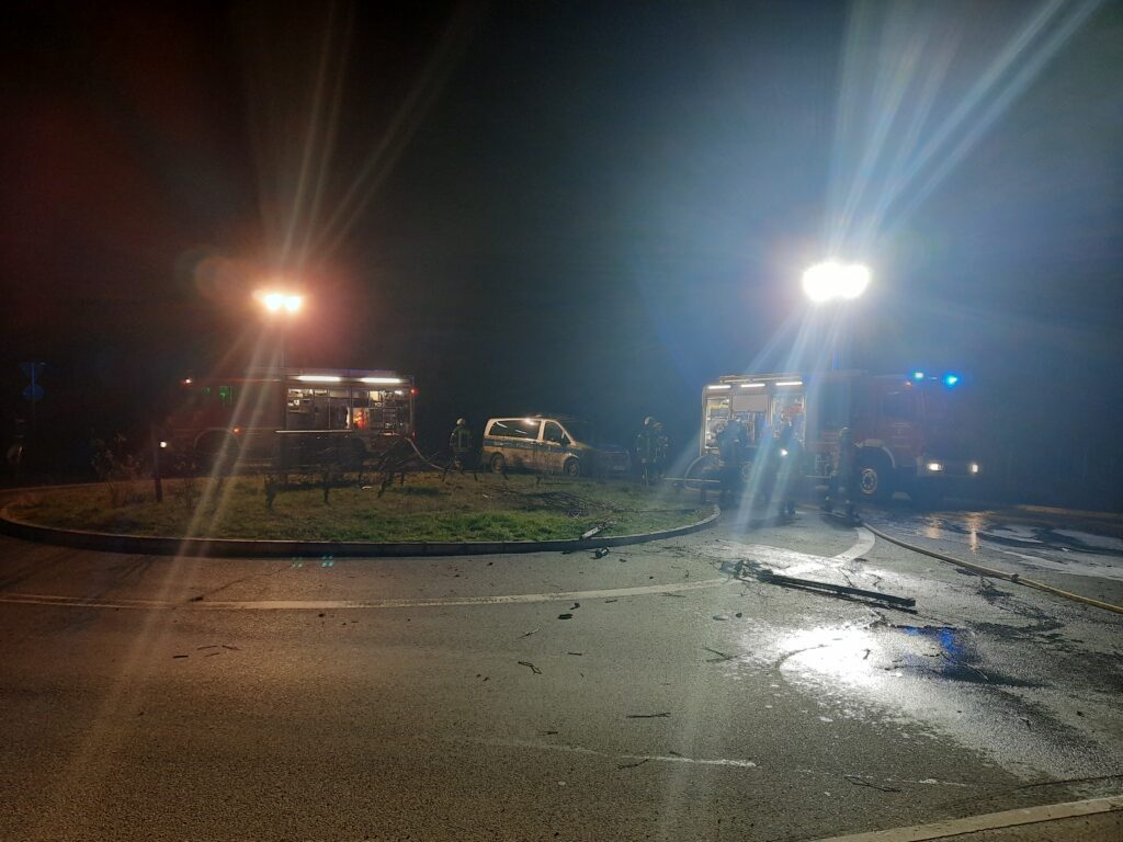 Brennender PKW am Kreisel Oestrich nach Verkehrsunfall