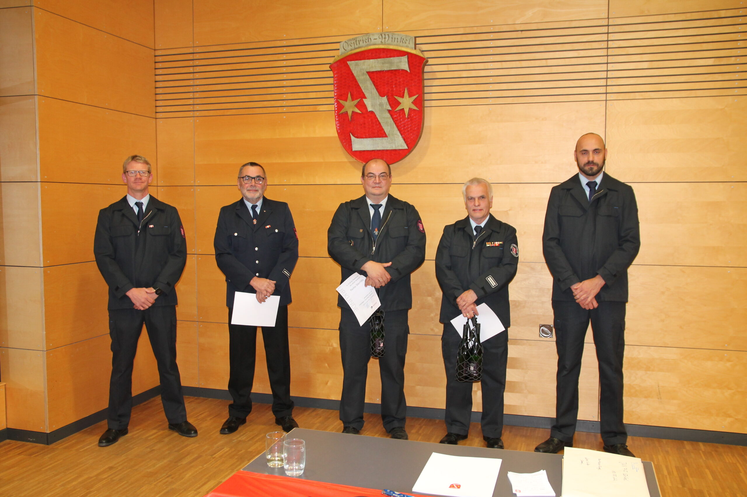 und 60 Jahre) geehrt. Vereinsvorsitzender Bernd Pfaff, Wehrführer Markus Kreis und der