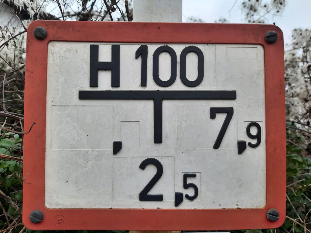 Es sind weiße, rechteckige Schilder mit Maßen von 250 x 200 mm und einem 20 mm breiten roten Rand. Die unteren schwarzen Zahlen auf dem Schild geben die Lage des Hydranten in Meter- Entfernung nach vorwärts, links oder rechts an.