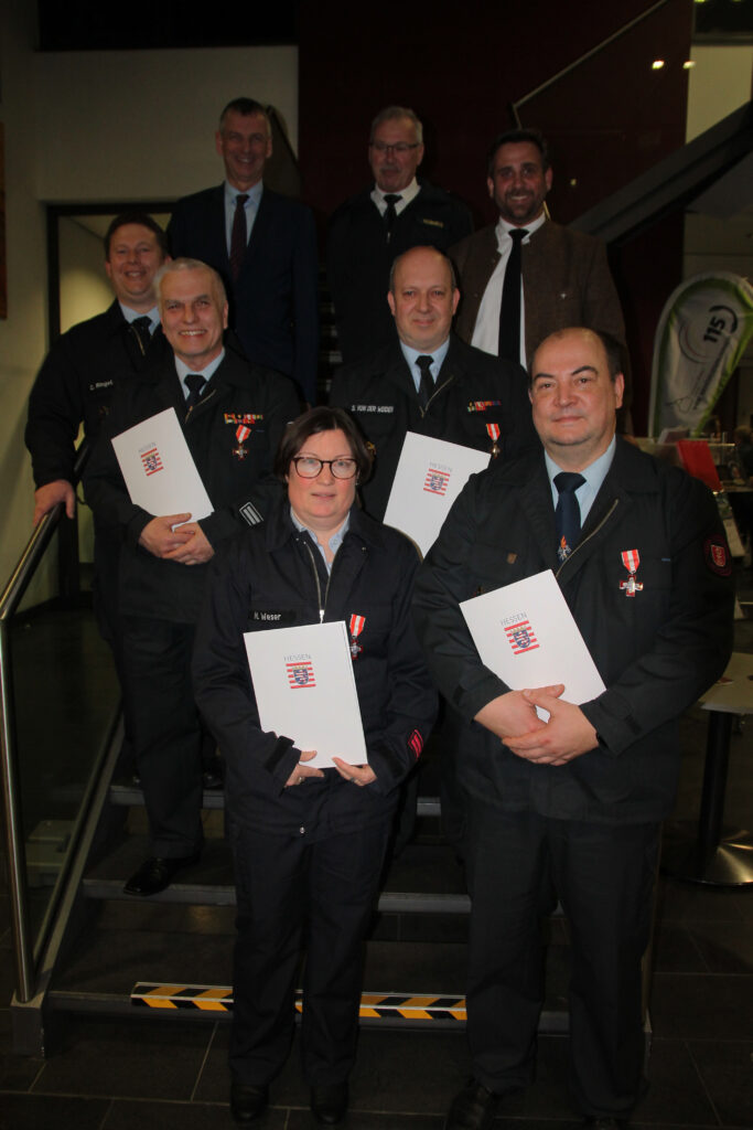 Silberne u. Goldene Brandschutzehrenzeichen: von links hinten Landrat Frank Kilian, stellv. Kreisbrandinspektor Reiner Oswald, Erster Stadtrat Björn Sommer, Stadtbrandinspektor Christian Ringel, Siegward Idstein, Stefan von der Weiden, Melanie Weser und Pavlos Stavridis