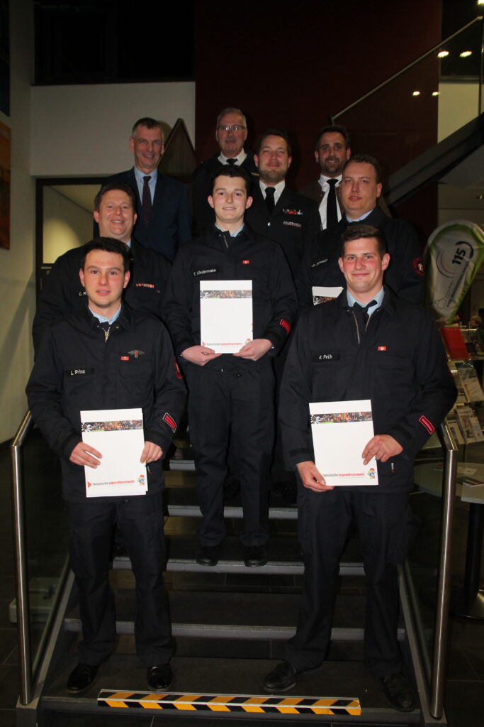 Florian Medaille in Bronze: von links hinten Landrat Frank Kilian, stellv. Kreisbrandinspektor Reiner Oswald, Kreisjugendfeuerwehrwart Benjamin Schaich, Erster Stadtrat Björn Sommer, Stadtbrandinspektor Christian Ringel, Tim Kindermann, Jan Semmler, Lucas Prinz und Rico Peth