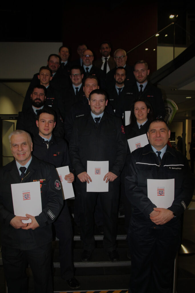 Anerkennungsprämien: von hinten links Stadtbrandinspektor Christian Ringel, Landrat Frank Kilian, Erster Stadtrat Björn Sommer, Bernhard Bickelmaier, Thorsten Koch, Manfred Kühn, Peter Profaska, Karl Seitelmann, Julian Schmid, Patrick Rammersbach, Jan Semmler, Viktor Sprick, Lucas Prinz, Jens Wilhelm, Christina Martin, Siegward Idstein und Alexander Bauschke.