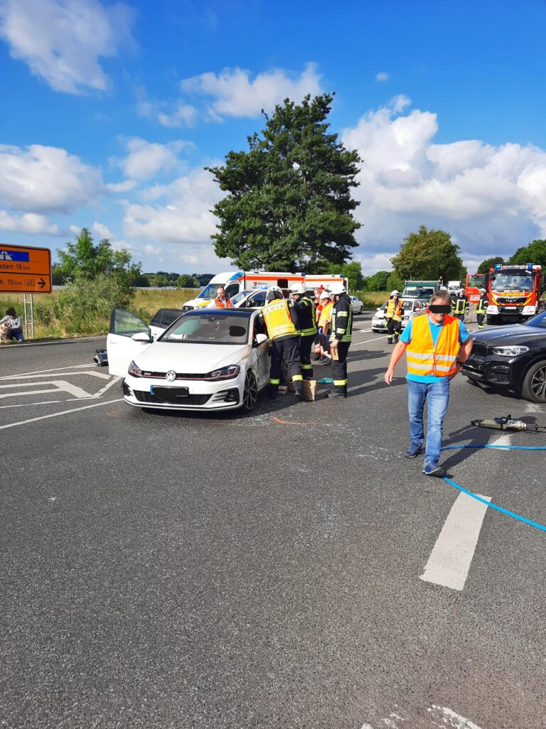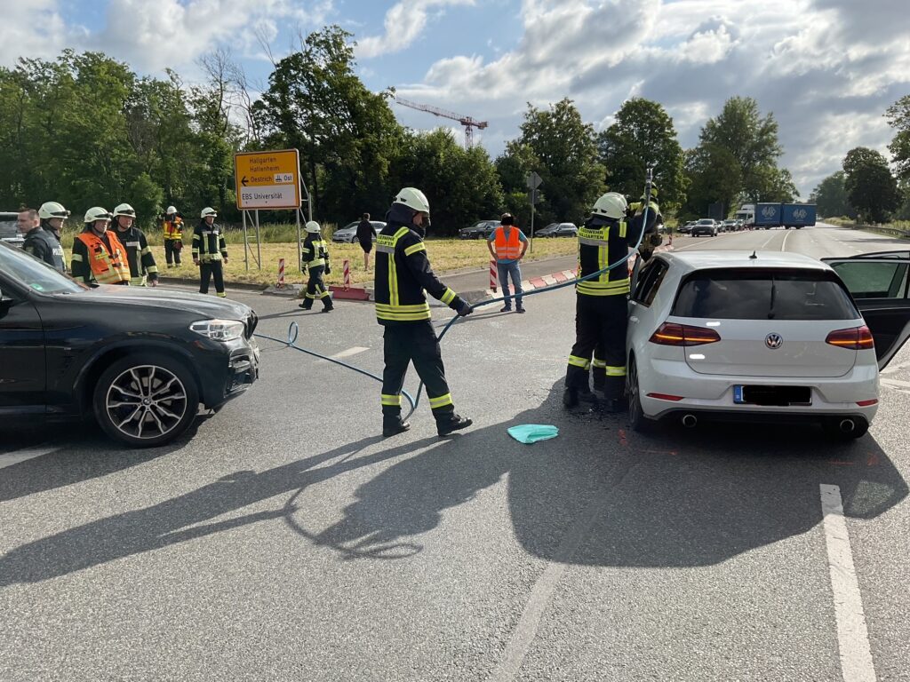 zu einem Verkehrsunfall mit zwei Fahrzeugen. Insgesamt waren 2 Personen und ein Hund betroffen, wobei eine Person mit Verletzungen ins Krankenhaus kam. Als Ersthelfer waren zwei Feuerwehrleute sowie ein Polizeibeamter direkt vor Ort. Ein Unfallfahrzeug musste die Feuerwehr vom anderen PKW von der Fahrertür wegziehen um die Person, die im Fahrzeug eingeschlossen aber nicht eingeklemmt war, zu befreien. Mittels technischen Geräts wurde die Fahrertür geöffnet und die Person konnte mit Unterstützung des Rettungsdienstes selbständig aussteigen. Während des Einsatzes war die B42 im Unfallbereich gesperrt und der Verkehr wurde von der Ordnungspolizei aus Geisenheim und Oestrich-Winkel geregelt. Neben den Feuerwehren aus Oestrich, Hallgarten, Mittelheim und Hattenheim waren zwei Rettungswagen, ein Notarzt, die Ordnungspolizei Geisenheim und Oestrich-Winkel sowie die Polizei im Einsatz.