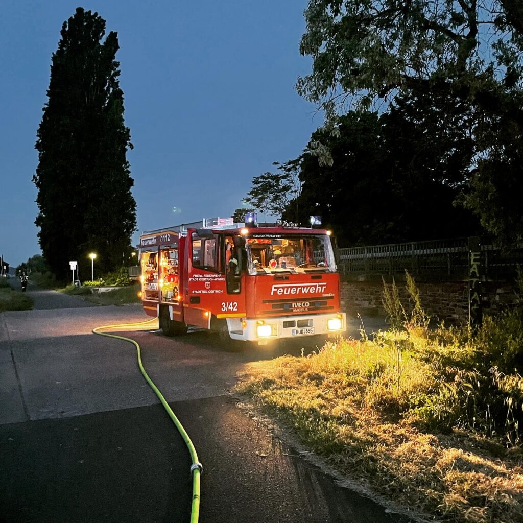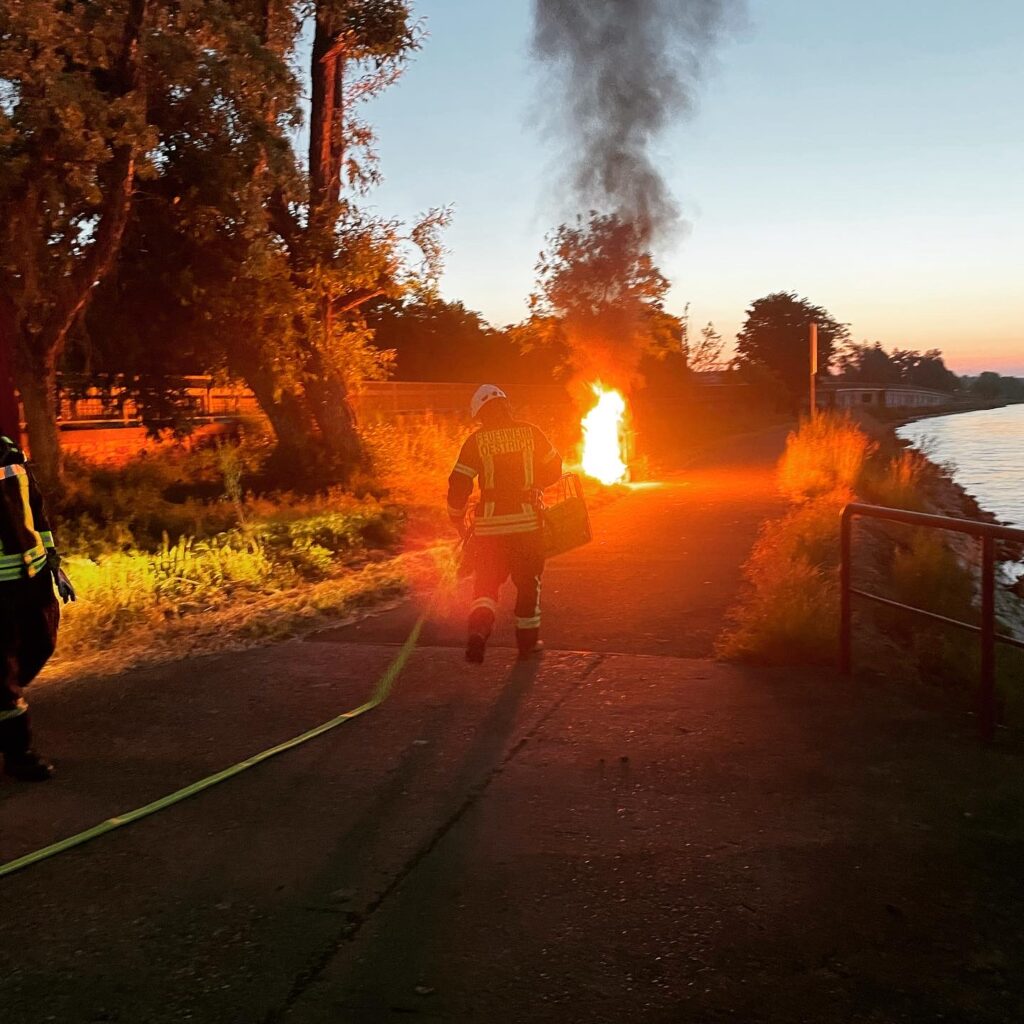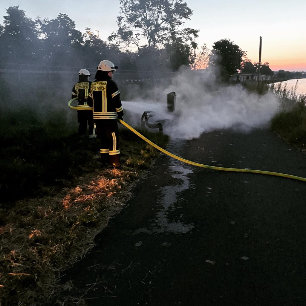 In den frühen Morgenstunden wurden wir zu einer brennenden Parkbank am Rhein gerufen. Vor Ort konnte eine in Vollbrand befindliche Bank vorgefunden werden. Das Feuer wurde mit einem C-Rohr gelöscht.