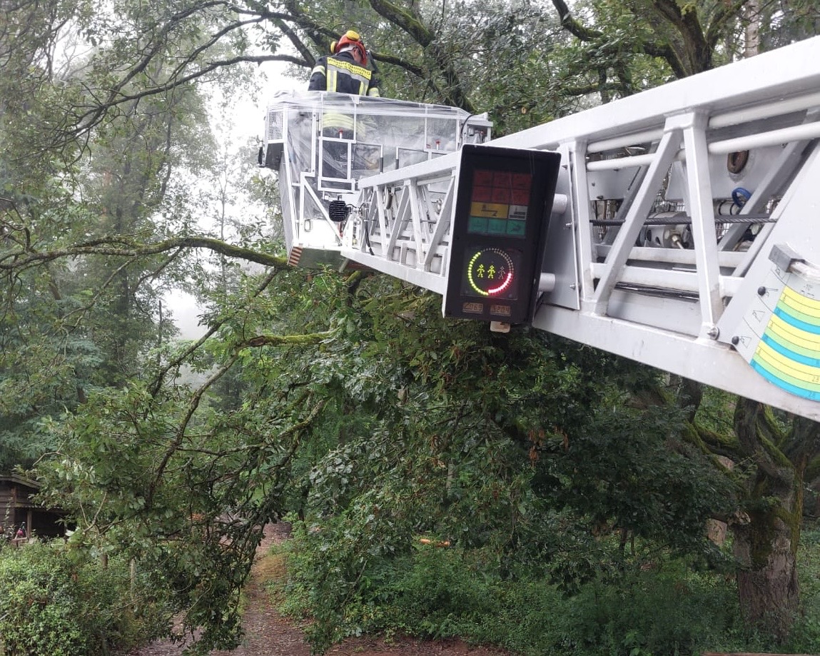 Um kurz vor 10 wurde unsere Drehleiter erneut gefordert. In Hallgarten drohte ein größerer Ast eines Baumes auf einen Gehweg zu stürzen. Mittels Elektrokettensäge wurde der Ast Stück für Stück über die Drehleiter beseitigt.