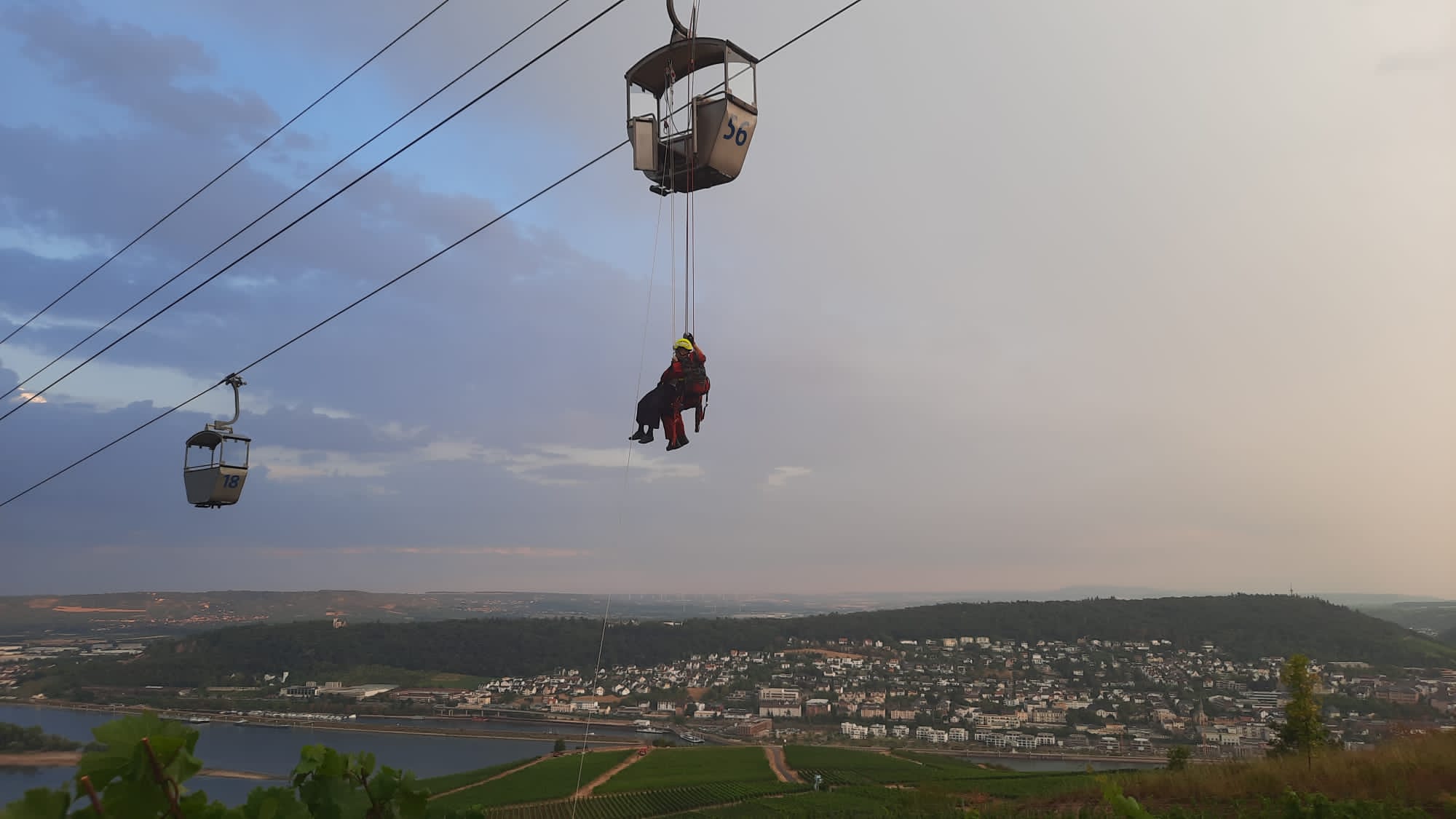 Am Abend wurde unsere Drehleiter, sowie der Mannschaftstransportwagen nach Rüdesheim zur dortigen Seilbahn alarmiert. Hier kam es zu einem technischen Defekt, der zu einem Totalausfall der Seilbahn führte. Durch uns wurden insgesamt 4 Personen über die Drehleiter aus den Fahrgondeln gerettet und mehrere Personen betreut. Insgesamt wurden 41 Personen durch die Rheingauer Feuerwehren gerettet.