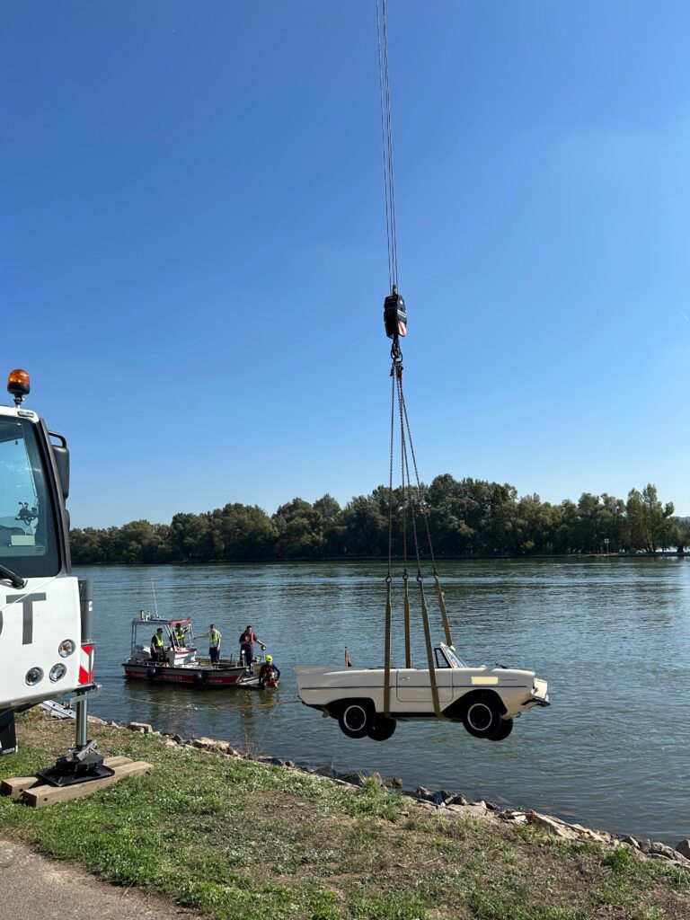 Wir wurden kurz nach dem ersten Einsatz zu einem Amphibienfahrzeug alarmiert, dass auf dem Rhein zu sinken began. Bei unserem Eintreffen war das Fahrzeug bereits vollständig in Ufernähe gesunken und alle Insassen konnten durch die DLRG aufgenommen werden. Daher beschränkte sich unsere Tätigkeit auf die Sicherung des Fahrzeugs. Im Anschluss unterstützten wir die Bergung mittels Bergekran.