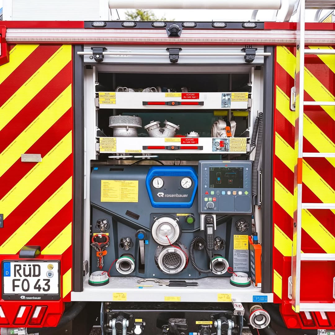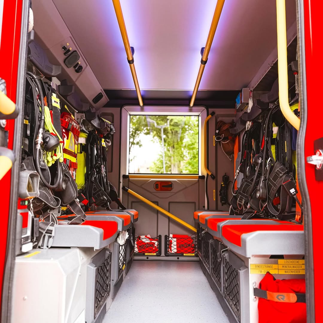 Zur Menschenrettung ist eine vierteilige Steckleiter und eine Schleifkorbtrage sowie ein Rettungsbrett verladen.