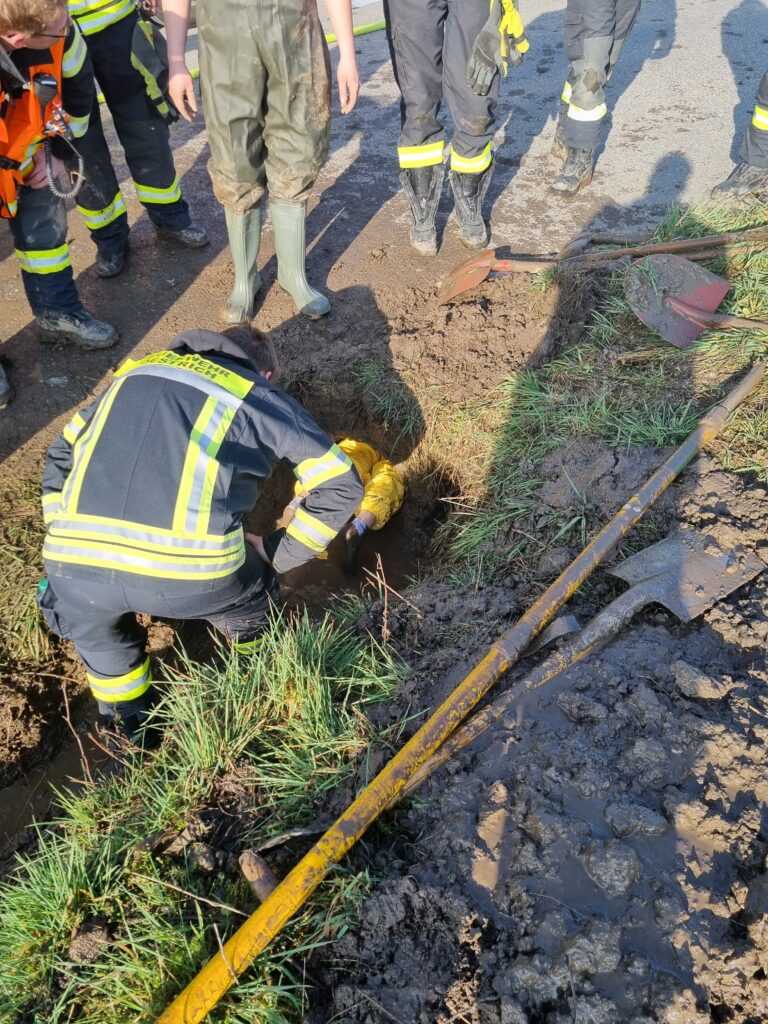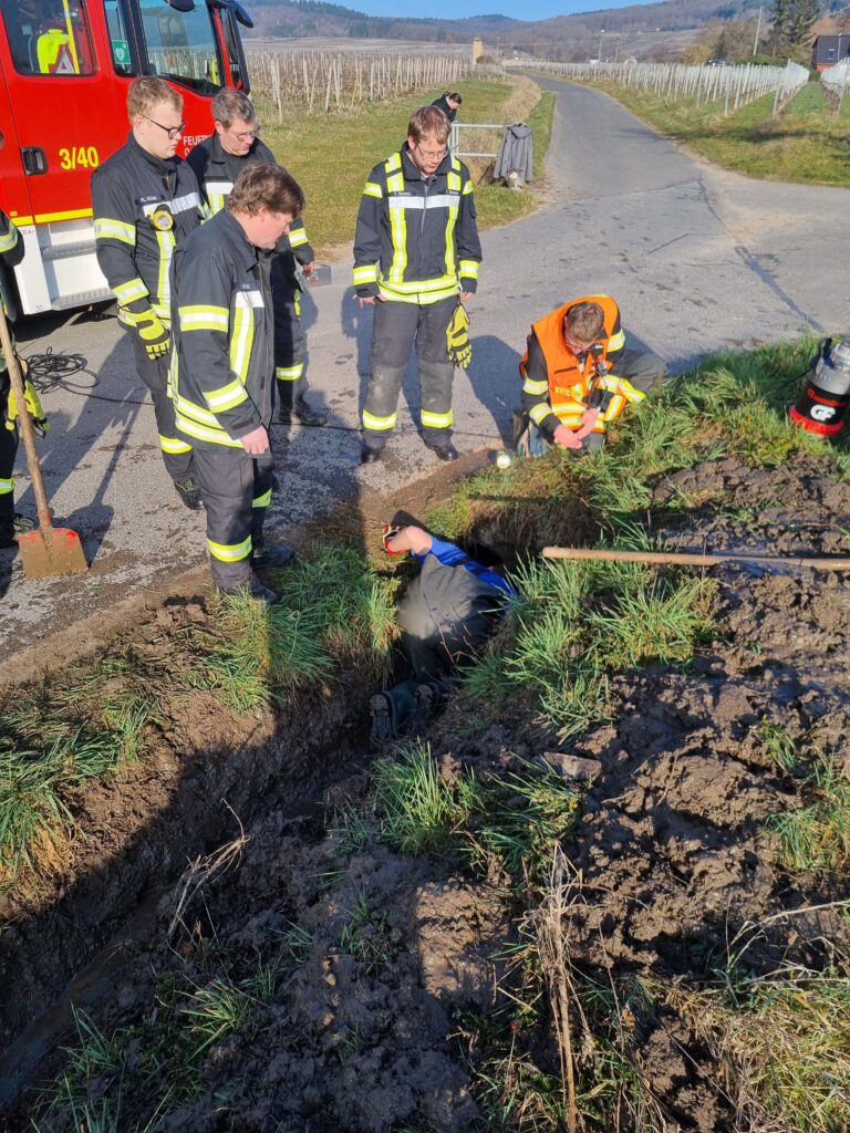Oestrich-Winkel – Am Sonntagmorgen wurde die Feuerwehr Oestrich zu einer Notlage eines großen Schweizer Mischlinghundes alarmiert. Der siebenjährige Hund steckte im Gottestal in einem ca. zehn Meter langen Abwasserrohr unterhalb einer Straßenabzweigung in den Weinbergen fest. Nach Erkundung der Lage konnte man den Hund etwa zwei Meter vor dem Rohrende ausmachen. Mittels Schaufeln und Spaten wurde der Arbeitsbereich vor dem Rohraustritt vergrößert und Wasser aus dem Graben abgepumpt. Zwei Feuerwehrleute mit Wathose haben abwechselnd halb im Rohr drin weiterhin Schlamm mit verschieden Werkzeugen gelöst und rausgeholt, sodass die Hundebesitzerin zum Schluss selbst fast komplett im Rohr die letzten 20cm Schlamm vor ihrem Hund Bless entfernen konnte. Danach lockte sie ihn – was auch mit Erfolg endete und er langsam und sichtlich erschöpft herausgekrochen kam. Die gesamte Rettungsaktion dauerte 80 Minuten und die 15 Einsatzkräfte der Feuerwehr erfreuten sich sichtlich mit den beiden überglücklichen Hundebesitzern. Am frühen Nachmittag berichteten die Hundebesitzer das Bless nach einer gründlichen Reinigung es sehr gut ginge und er tiefen entspannt daheim rumlaufen und normal fressen würde. Da keine äußeren Verletzungen erkennbar waren werden sie ihm die Sonntagsruhe noch gönnen und den Tierarzt am Montagvormittag aufsuchen.