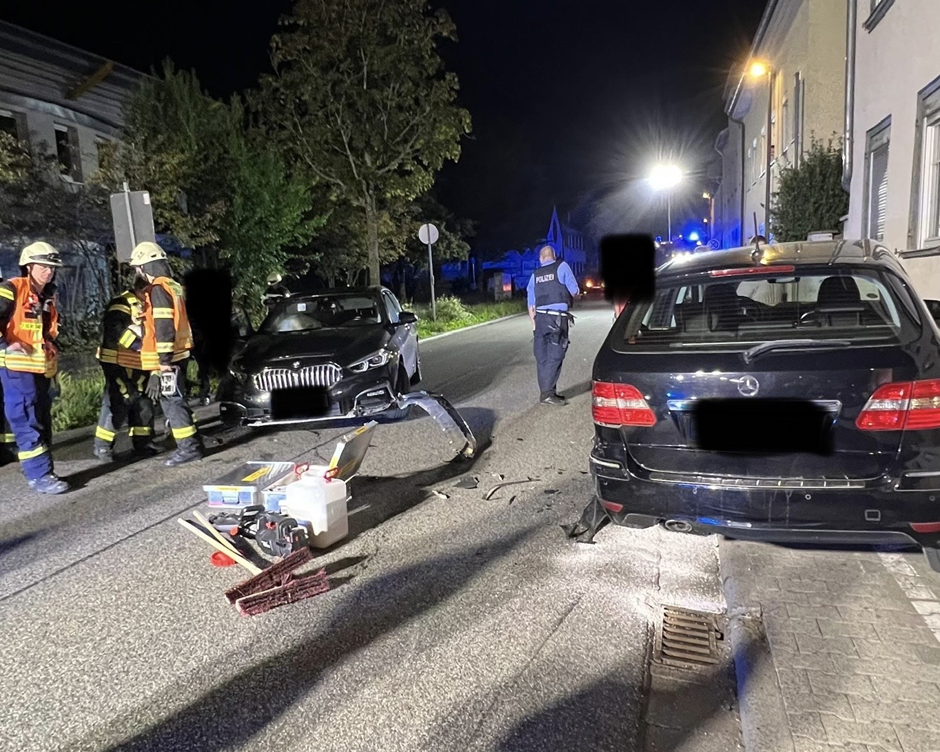 Ein lauter Knall führte uns am späten Abend zu einem Einsatz im Ortsgebiet. Hier kam es zu einem Alleinunfall nach Frontalzusammenstoß mit