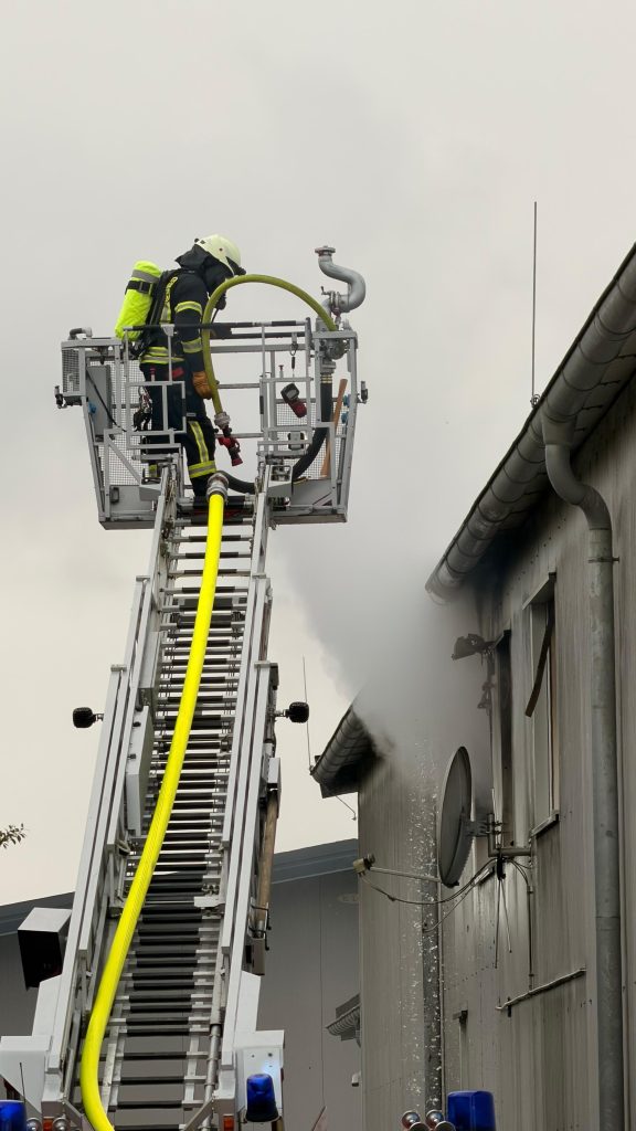 Es kam zu einem Wohnungsbrand in einer Lager- und Produktionsshalle. Wir unterstützen die Brandbekämpfung über die Drehleiter, sowie einem Trupp im Innenangriff.