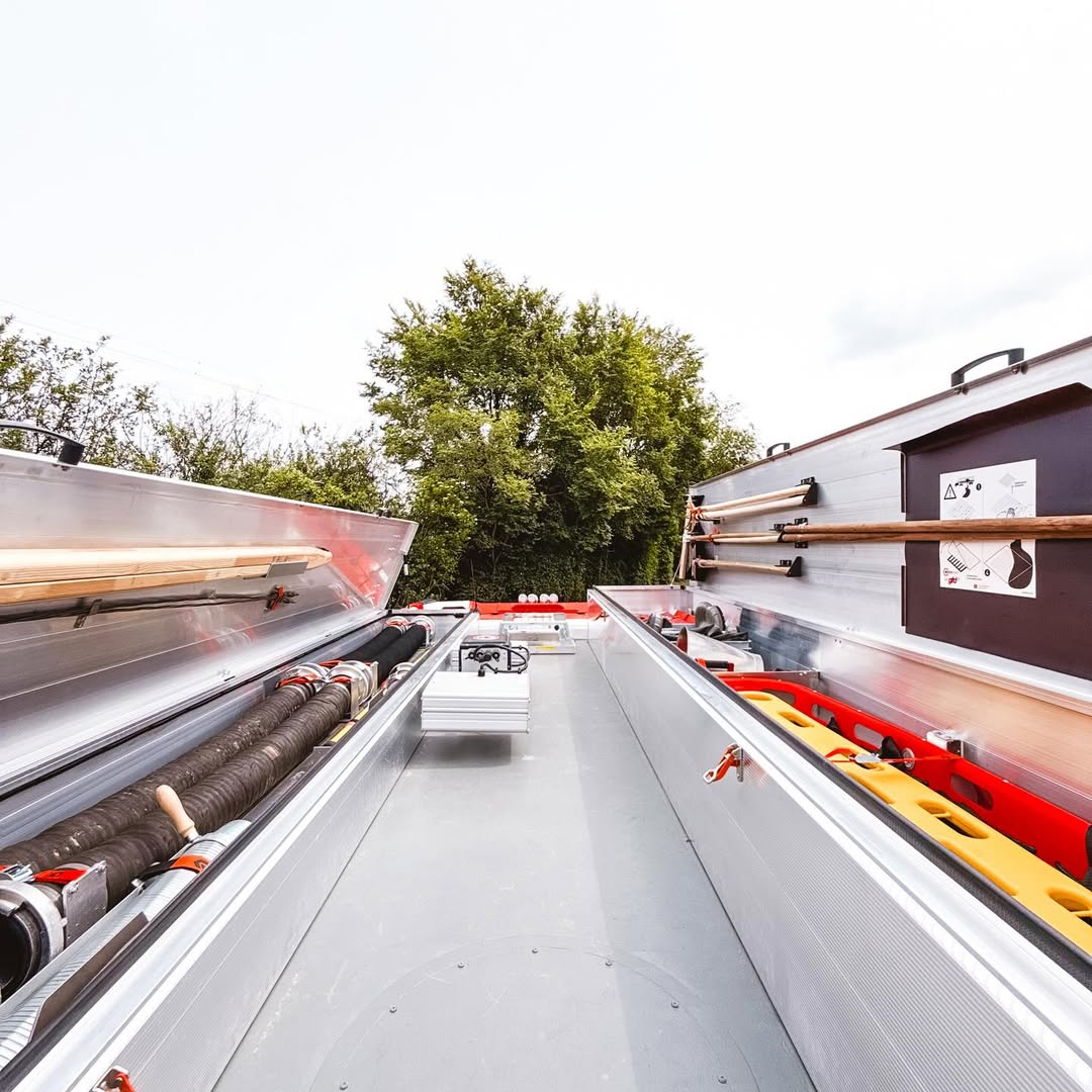 Zur Menschenrettung ist eine vierteilige Steckleiter und eine Schleifkorbtrage sowie ein Rettungsbrett verladen.